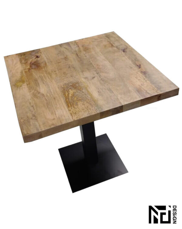 Het gebruik van hoogwaardig mangohout geeft de tafel een natuurlijke en warme uitstraling. Het mangohout is duurzaam en robuust, waardoor de tafel bestand is tegen intensief gebruik in een drukke horecaomgeving. Het onderstel van zwart gepoedercoat staal biedt niet alleen stabiliteit en duurzaamheid, maar geeft ook een eigentijdse en industriële uitstraling aan de tafel.