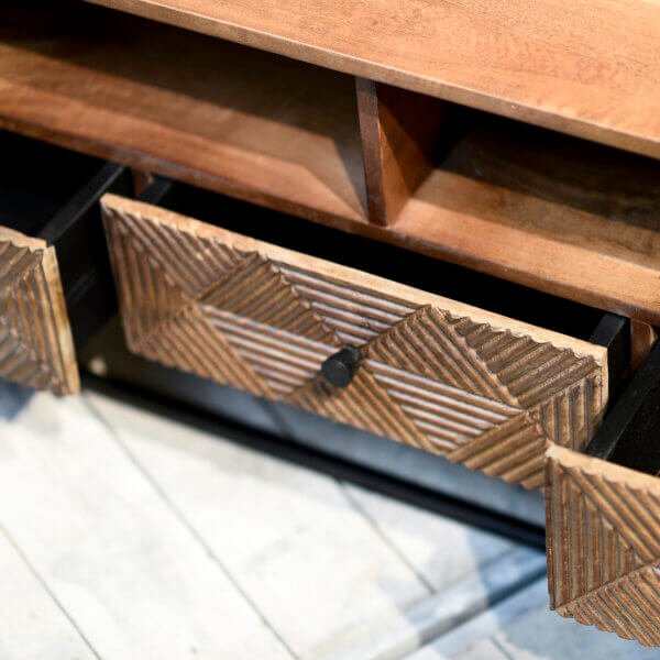 - Ruimte en Opbergruimte. Met een hoogte van 55 cm, een breedte van 125 of 150 cm en een diepte van 40 cm biedt dit tv-meubel voldoende opbergruimte voor al je elektronica, dvd’s en andere accessoires. Het meubel is voorzien van twee deuren die gemakkelijk openen en sluiten, evenals twee of vier lades die perfect zijn om kleinere spullen georganiseerd op te bergen.