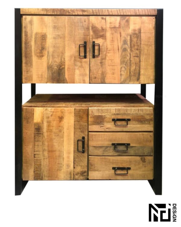 - Flexibiliteit en aanpasbaarheid Het kabinet is uitgerust met drie deuren en drie lades, waardoor u verschillende items gescheiden kunt opbergen. Bovendien zijn de planken verstelbaar, zodat u de opbergruimte kunt aanpassen aan uw specifieke behoeften.